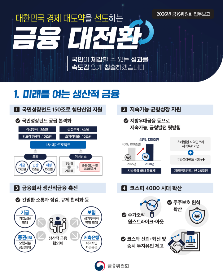 지역금융은 정책금융 지방공급 확대 목표제(2028년 45%)와 지방을 우대하는 규제 개선 등으로 지역에 더 많은 자금을 더 좋은 조건으로 공급할 수 있게 한다.
