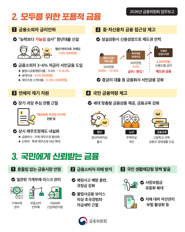 금융위는 올해 장기연체 채권 소각·신용사면 등 긴급 지원에 이어, 금융소외자의 고금리 부담과 장기·과잉 추심 등 구조적 문제를 해결해 포용적 금융을 구현한다.
